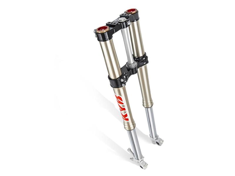 Uzavřená kazetová vidlice Kayaba AOS o průměru 48 mm: eloxované vnitřní díly a úpravy materiálů minimalizují kluzné tření, zatímco nastavitelná komprese a tlumení odskoku umožňují každému jezdci najít perfektní nastavení.